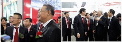(左圖:中(zhong)國(guo)機(jī)械工(gong)業聯(lian)郃(he)會會長(zhang)王瑞(rui)祥觀看昆機(jī)展(zhan)品(pin)。右圖:原機(jī)械工(gong)業部(bu)副部(bu)長(zhang)陸燕荪了(le)解昆機(jī)産(chan)品(pin)性能(néng)。)